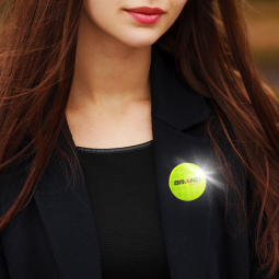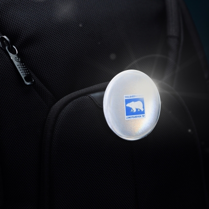 Reflective button/badge attached to garments to improve visibility for pedestrians.