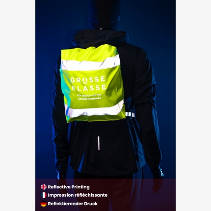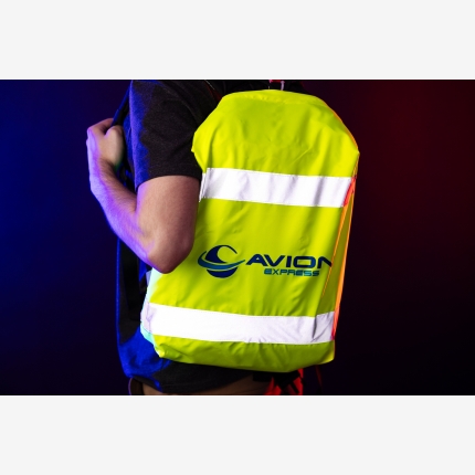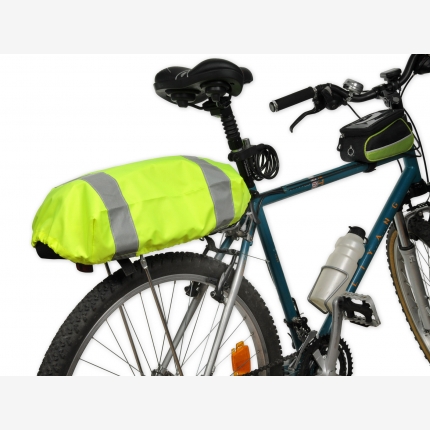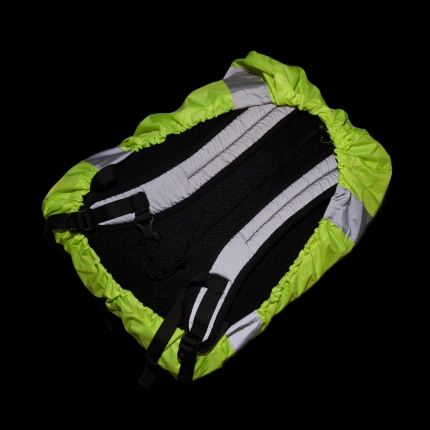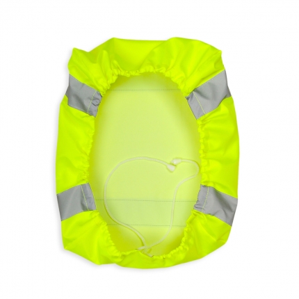 Covers of this type fulfill two functions: they protect the backpack from rain or snow and they improve the visibility of the user on the road, hiking trail, or at work. The cover has two reflectors. Waterproof cover for a backpack or a bicycle pannier. 100 % waterproof. Convenient backpack plastic clips with a snap. 100 % fluorescent yellow polyester. Designed for standard backpacks (25–42 L).