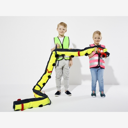 The walking snake is made of waterproof fabric and filled with lightweight foam. There are handles on the snake-shaped hose fitted with reflective strips to help children position themselves in pairs. The snake helps maintain safety and discipline when walking with a group of children.