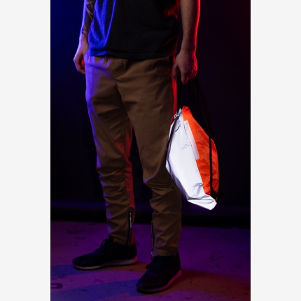 A lightweight and durable reflective bag for shopping as well as any other purpose. Thanks to the reflective material used for the entire bag, it can serve as a great alternative to traditional reflectors. By using a reusable reflective bag, you are taking care of both the environment and safety at the same time. The bag has two sides, one is fully reflective, the other side is dark blue, orange or red with a diamond lattice design. Compliance of the reflective element with the requirements of standard en 13356. The bag is made of reflective polyester (at least 210d) coated with a waterproof layer. It has an extra pocket with a zipper.