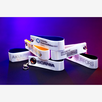 Reflective keyring/ hanger attached to bags/backpacks/outer clothing that provides more visibility after dark.Certified reflective films come in two colors: yellow and silver. Should our customers require a bigger color palette, we can offer RGR Reflomax foil of promotional quality.Product eligible for EN certification provided it is made from certified foil and complies with the required reflective surface.
